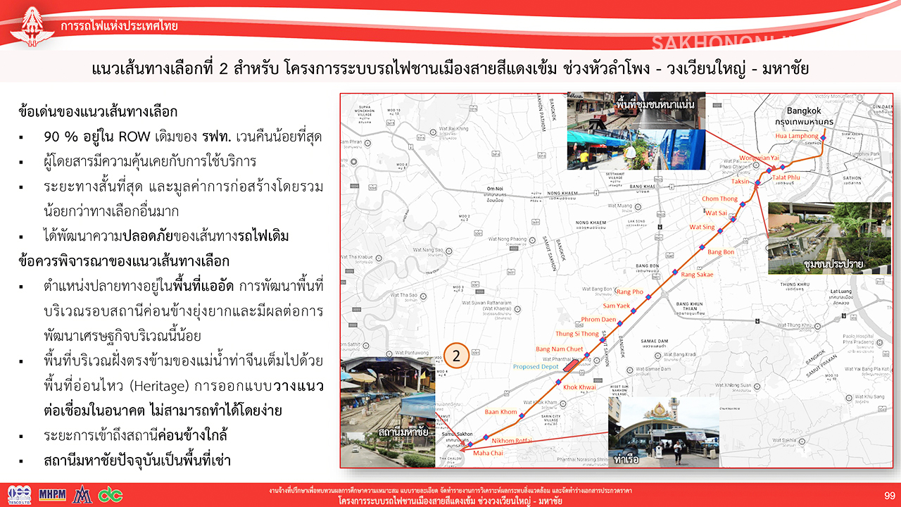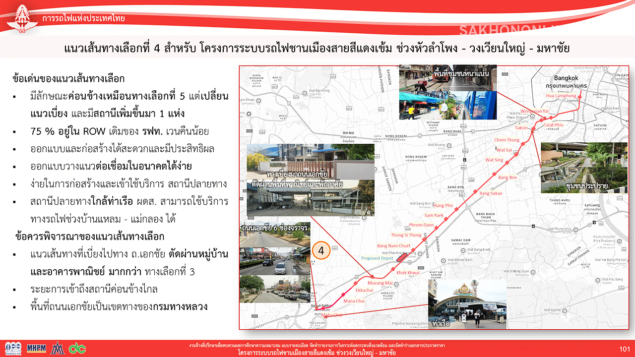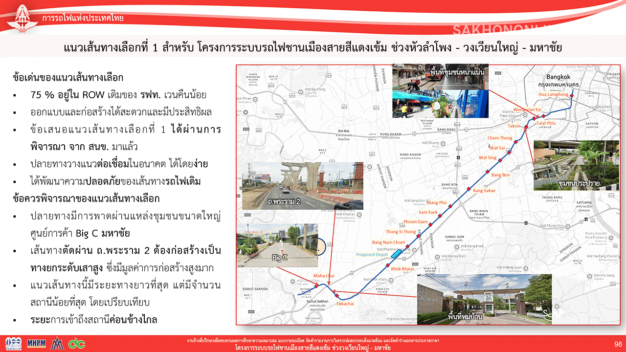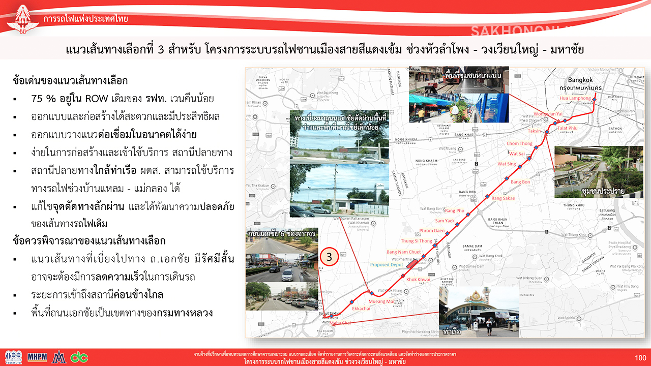 การรถไฟฯ ปฐมนิเทศสายสีแดง เวที กทม. แจงที่มา 5 แนวเส้นทางเลือก ปรับเปลี่ยนจากแผนเดิมเมื่อ 20 ปีก่อน ชูข้อดีสถานีปลายทางสี่แยกโรงพัก มหาชัย สะดวกรองรับโครงการอนาคต เชื่อมท่าเรือท่าฉลอมไม่ไกล พบเสนอเพิ่มสถานีคลองสานใต้ดิน เชื่อมต่อสายสีทอง ส่วนชาวชุมชนวุฒากาศ–วัดไทร–วัดสิงห์ กังวลปัญหาเวนคืนและผลกระทบก่อสร้าง หลังคัดค้านศูนย์คมนาคมตากสินปี 59 ขณะที่บริษัทที่ปรึกษาย้ำพยายามออกแบบให้กระทบน้อยที่สุด
