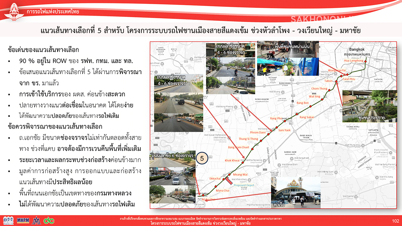 ส่วนปลายทางสถานีมหาชัย เส้นทางเลือกที่ 1 (คลองครุ) ผลการศึกษาในอดีตยังไม่มีการพัฒนาที่ดิน อีกทั้งตามแผนพัฒนาภาครัฐมีโครงการเชื่อมต่อไปยังสถานีปากท่อ และทางรถไฟสายใต้ แต่ปัจจุบันมีการพัฒนาที่ดินเป็นหมู่บ้าน มีห้างสรรพสินค้าบิ๊กซี มหาชัย และยังมีทางยกระดับมอเตอร์เวย์ M82 ต้องสร้างทางรถไฟยกระดับข้ามทางด่วน ค่าก่อสร้างแพงขึ้นและซับซ้อน ส่วนเส้นทางเลือกที่ 2 สิ้นสุดที่สถานีมหาชัยเดิม ยากที่จะพัฒนาเพิ่มเติม เชื่อมต่อโครงการในอนาคตไม่ได้ เพราะเป็นพื้นที่อ่อนไหว อีกทั้งสถานีมหาชัยไม่ใช่เขตพื้นที่การรถไฟฯ แต่เป็นพื้นที่เช่า ส่วนเส้นทางเลือกที่ 3-4-5 (บริเวณสี่แยกโรงพัก) มีถนนกว้าง 6 ช่องจราจร สามารถเชื่อมต่อโครงการในอนาคต และสามารถเดินเท้าไปยังท่าเรือข้ามฟากไปท่าฉลอมได้ไม่ไกลมากนัก