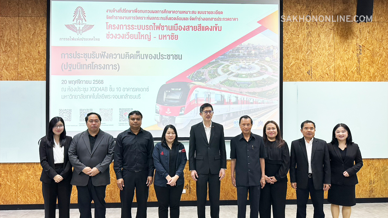 วันนี้ (20 พ.ย.) ที่อาคารเคเอ็กซ์ (Knowledge Exchange – KX) มหาวิทยาลัยพระจอมเกล้าธนบุรี ถนนกรุงธนบุรี กรุงเทพฯ การรถไฟแห่งประเทศไทย (รฟท.) จัดการประชุมรับฟังความคิดเห็นของประชาชน (ปฐมนิเทศโครงการ) งานจ้างที่ปรึกษาเพื่อทบทวนผลการศึกษาความเหมาะสม แบบรายละเอียด จัดทำรายงานการวิเคราะห์ผลกระทบสิ่งแวดล้อม และจัดทำร่างเอกสารประกวดราคา โครงการระบบรถไฟฟ้าชานเมืองสายสีแดงเข้ม ช่วงวงเวียนใหญ่-มหาชัย โดยมีกิจการค้าร่วม (Consortium) ในนามกลุ่มบริษัท เทสโก้ จำกัด เป็นผู้รับจ้าง ซึ่งมีผู้แทนหน่วยราชการ ผู้แทนภาคเอกชน ภาคประชาสังคม สื่อมวลชน และประชาชนผู้สนใจโครงการเข้าร่วมรับฟังในครั้งนี้