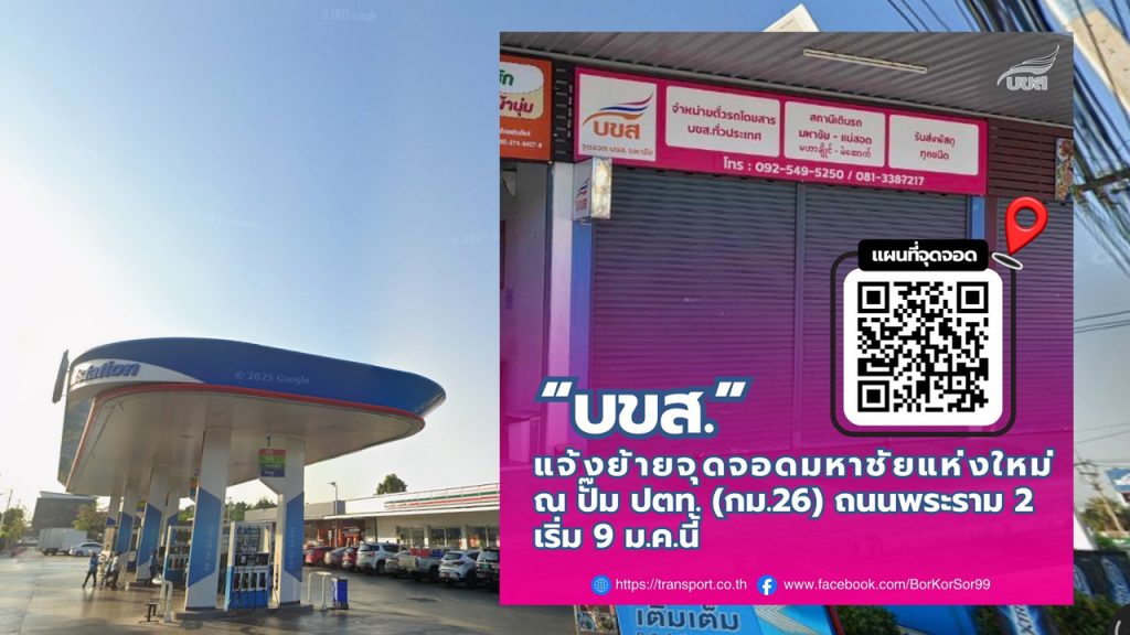 บขส.ประกาศตั้งแต่ 9 ม.ค. 69 รถโดยสารของ บขส. ไม่เข้าเทศบาล 8 แต่ย้ายไปจอดที่ปั๊ม ปตท. ถนนพระรามที่ 2 กม. 26 ก่อนถึงห้างโฮมโปรมหาชัย อำนวยความสะดวกประชาชน เดินทางไปยังพื้นที่ภาคใต้