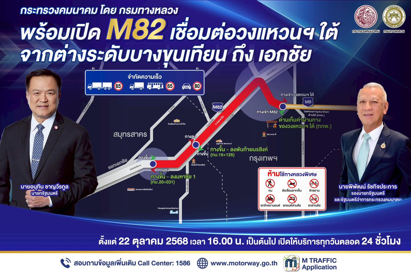 รายงานข่าวแจ้งว่า กระทรวงคมนาคม กรมทางหลวง (ทล.) และการทางพิเศษแห่งประเทศไทย (กทพ.) เตรียมจัดพิธีเปิดทดลองให้บริการทางหลวงพิเศษระหว่างเมืองหมายเลข 82 (M82) เชื่อมต่อวงแหวนกาญจนาภิเษกด้านใต้ (M9) จากต่างระดับบางขุนเทียน – เอกชัย ในวันพรุ่งนี้ (22 ต.ค.) เวลา 13.00 – 16.00 น. ณ ด่านมหาชัย 1 (ฝั่งขาเข้าบริเวณหน้าโรงเรียนวัดราษฎร์รังสรรค์ และฝั่งขาออกบริเวณหน้าตลาดลีลา) ถนนพระราม 2 กม.20 ต.คอกกระบือ อ.เมืองฯ จ.สมุทรสาคร โดยมี นายพิพัฒน์ รัชกิจประการ รองนายกรัฐมนตรี และรัฐมนตรีว่าการกระทรวงคมนาคม เป็นประธานในพิธีเปิด