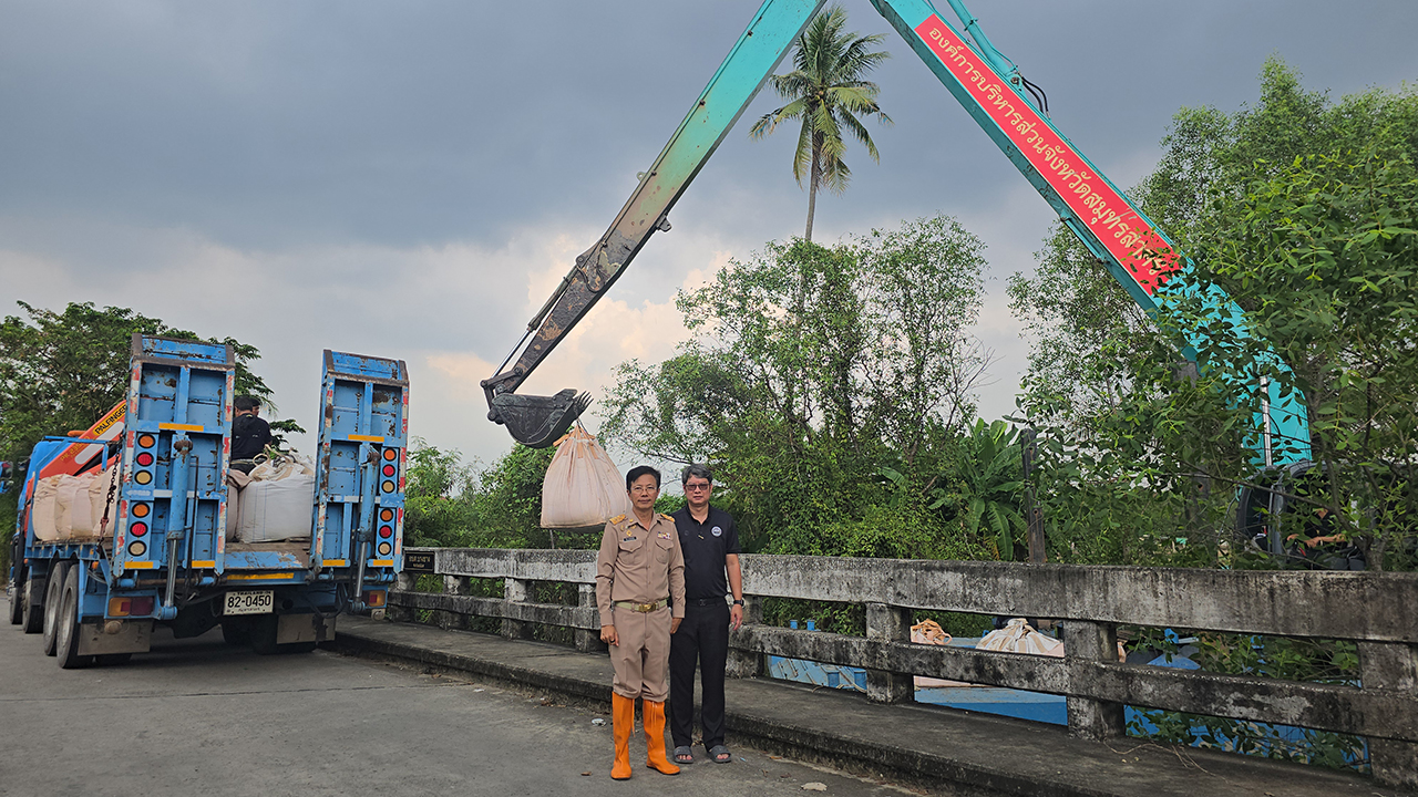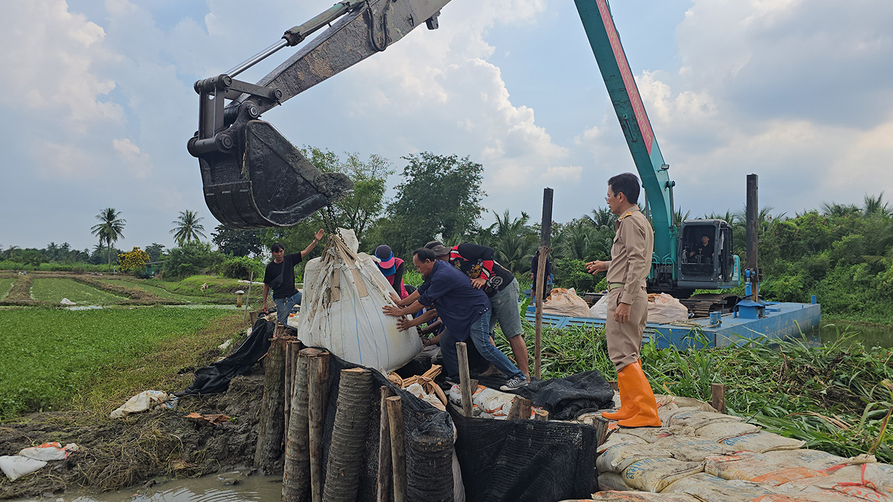 เมื่อเวลา 15.00 น. วันที่ 10 พ.ย. 2568 นายอุดม ไกรวัตนุสสรณ์ นายก อบจ.สมุทรสาคร พร้อมด้วย นายอภิชาต โพธิ์ถนอม รองนายก อบจ.สมุทรสาคร ได้ลงพื้นที่สวนเกษตรริมคลอง หมู่ 4 ต.บางยาง อ.กระทุ่มแบน จ.สมุทรสาคร เพื่อติดตามการซ่อมแซมคันดินกันตลิ่งพังด้วยบิ๊กแบ็ก ซึ่งทาง อบต.บางยาง ได้ขอสนับสนุนจากทาง อบจ.สมุทรสาคร ราว 30 ถุง ขนาดถุงละ 1 ตัน นำมาวางแนวกั้นน้ำเข้าพื้นที่ทำเกษตรกรรมของประชาชนบริเวณดังกล่าว อันเนื่องจากคันดินริมตลิ่งถูกน้ำกัดเซาะจนพังลงเป็นความยาวประมาณ 3 เมตร ส่งผลทำให้น้ำจากคลองไหลเข้าสวนที่อยู่ระหว่างการเพาะปลูกพืชผลทางการเกษตร และพื้นที่อยู่อาศัย