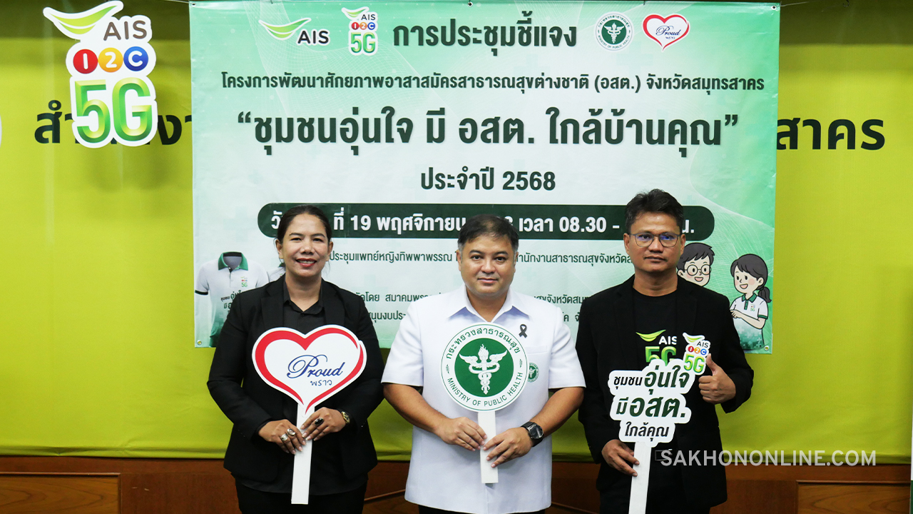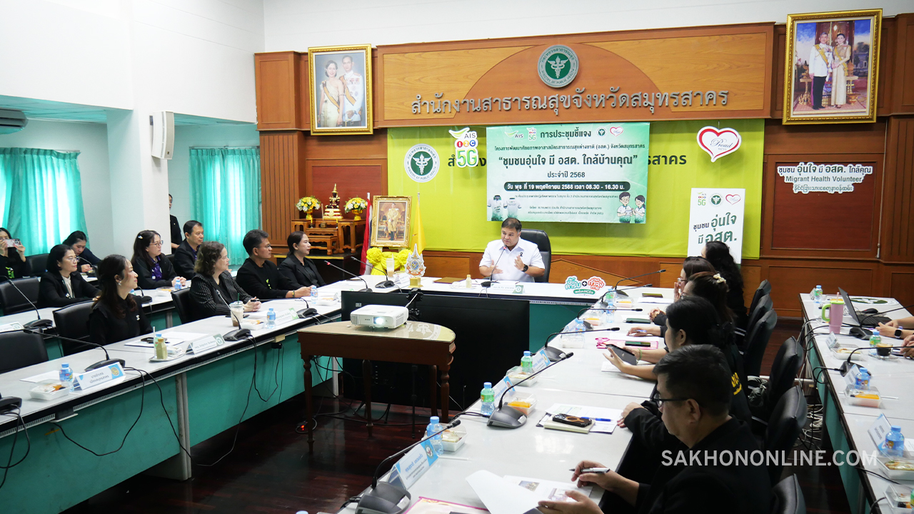เมื่อเวลา 09.00 น. วันที่ 19 พฤศจิกายน 2568 ได้มีการจัดประชุมชี้แจงโครงการพัฒนาศักยภาพอาสาสมัครสาธารณสุขต่างชาติ (อสต.) จังหวัดสมุทรสาคร “ชุมชนอุ่นใจ มี อสต. ใกล้บ้านคุณ“ ประจำปี 2568 ณ ห้องประชุมแพทย์หญิงทิพาพรรณ ใบสมุทร ชั้น 2 สำนักงานสาธารณสุขจังหวัดสมุทรสาคร ต.บางหญ้าแพรก อ.เมืองฯ จ.สมุทรสาคร โดยมี นพ.ประกิจ สาระเทพ นายแพทย์สาธารณสุขจังหวัดสมุทรสาคร เป็นประธานกล่าวเปิดการประชุม พร้อมด้วย นายกรกฤษณ์ เสียงใส รักษาการหัวหน้างานปฏิบัติการภูมิภาค-ภาคกลาง บริษัท แอดวานซ์ อินโฟร์ เซอร์วิส จำกัด (มหาชน) หรือ AIS น.ส.มนัญชยา อินคล้าย นายกสมาคมพราว รวมถึงหัวหน้าส่วนราชการ ผู้แทนนายอำเภอ องค์กรปกครองส่วนท้องถิ่น กำนัน ผู้ใหญ่บ้าน ผู้อำนวยการ รพ.สต. อาสาสมัครสาธารณสุขประจำหมู่บ้าน (อสม.) คณะผู้บริหารของ AIS และหน่วยงานที่เกี่ยวข้องเข้าร่วม