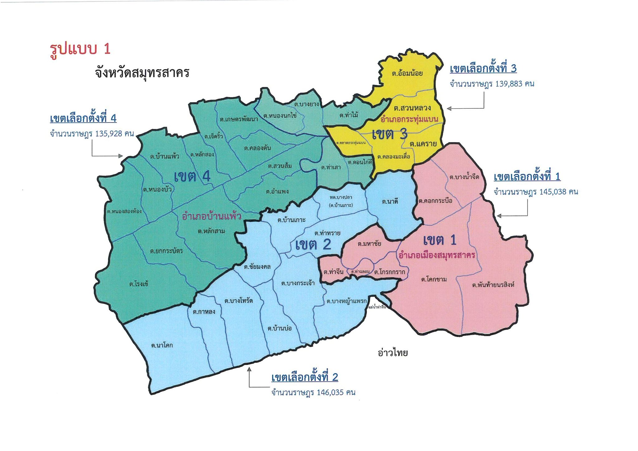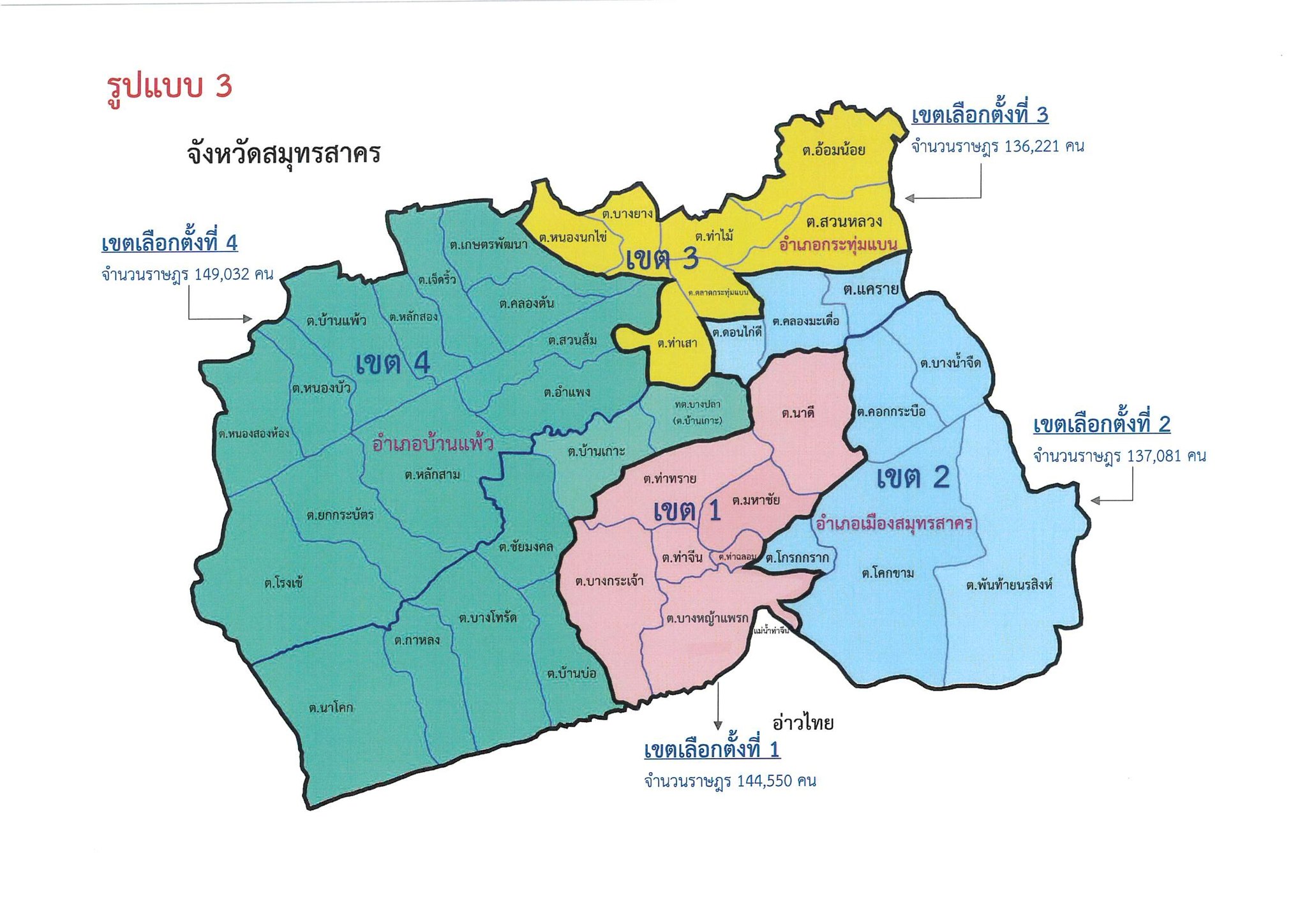 ผู้สื่อข่าวรายงานเพิ่มเติมว่า สำหรับรูปแบบการแบ่งเขตเลือกตั้งสมาชิกสภาผู้แทนราษฎร (สส.) แบบแบ่งเขตเลือกตั้ง คิดจากจำนวนราษฎรทั้งหมด 566,884 คน จำนวนเฉลี่ยราษฎรต่อ สส. 1 คน ในจังหวัดสมุทรสาคร เท่ากับ 141,721 คน โดยมีรูปแบบการแบ่งเขตเลือกตั้ง สส. จำนวน 3 รูปแบบ ให้พรรคการเมืองหรือประชาชนได้ร่วมแสดงความคิดเห็น ดังต่อไปนี้