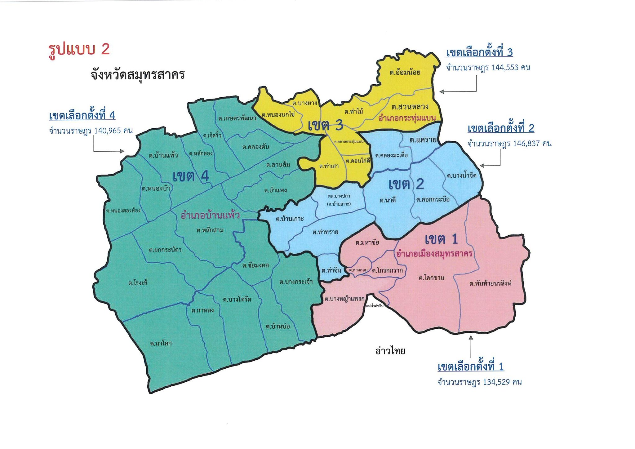 เขตเลือกตั้งที่ 2: อำเภอเมืองฯ เฉพาะตำบลท่าจีน ท่าทราย บ้านเกาะ นาดี คอกกระบือ และบางน้ำจืด | อำเภอกระทุ่มแบน เฉพาะตำบลแคราย และคลองมะเดื่อ จำนวนราษฎร 146,837 คน