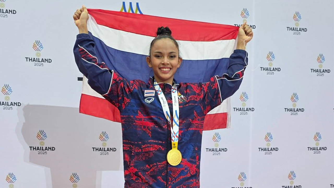 “กระแต” ศศิวิมล เมืองพวน นักยิมนาสติกทีมชาติไทย ชาวสมุทรสาคร โชว์ลีลาประทับใจกรรมการ คว้าเหรียญทองประเภทฟลอร์เอ็กเซอร์ไซส์ ในกีฬาซีเกมส์ 2025