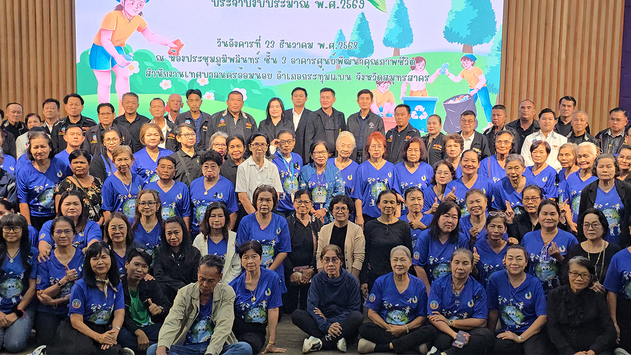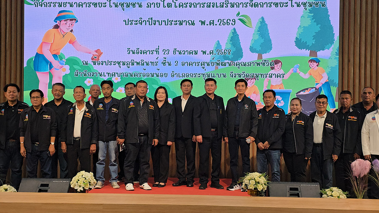 เมื่อเวลา 09.00 น. วันที่ 23 ธ.ค. 2568 นายบุญชู นิลถนอม นายกเทศมนตรีนครอ้อมน้อย เป็นประธานเปิดการอบรมกิจกรรมธนาคารขยะในชุมชน ภายใต้โครงการส่งเสริมการจัดการขยะในชุมชน ปีงบประมาณ พ.ศ.2569 ณ ห้องประชุมภูมิพลินทร์ ศูนย์พัฒนาคุณภาพชีวิต เทศบาลนครอ้อมน้อย อ.กระทุ่มแบน จ.สมุทรสาคร โดยมี จ.อ.สนิท ศรีอุ่นศรี ปลัดเทศบาลนครอ้อมน้อย พร้อมคณะผู้บริหาร สมาชิกสภา หัวหน้าส่วนราชการ และ คณะวิทยากรจากเทศบาลเมืองโคกขาม เทศบาลเมืองพันท้ายนรสิงห์ และเทศบาลตำบลแคราย ที่ได้มาถ่ายทอดองค์ความรู้ สร้างเข้าใจด้านการจัดการขยะชุมชนให้แก่ อาสาสมัครท้องถิ่นรักษ์โลก (อถล.) ประชาชนในพื้นที่ และเจ้าหน้าที่ผู้เกี่ยวข้อง เข้ารับการอบรม จำนวน 100 คน