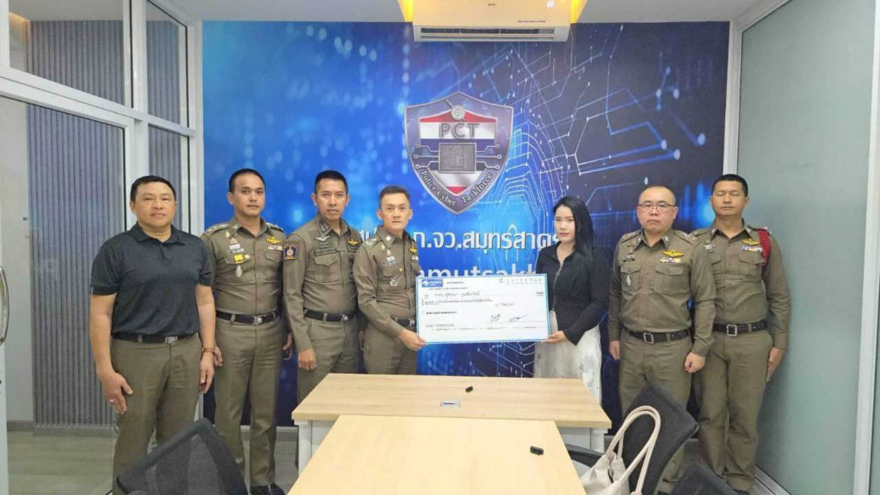 เมื่อเวลา 14.00 น. วันที่ 25 ธ.ค. 2568 ที่ศูนย์ปราบปรามอาชญากรรมทางเทคโนโลยีสารสนเทศ ตำรวจภูธรจังหวัดสมุทรสาคร (ศปอส.ภ.จว.สมุทรสาคร) พล.ต.ต.ธีระเดช อธิภัคกุล ผบก.ภ.จว.สมุทรสาคร พร้อมด้วย พ.ต.อ.พิเชษฐ์พงศ์ แจ้งค้ายคม รอง ผบก.ภ.จว.สมุทรสาคร พ.ต.อ.สิทธิพร กะสิ ผกก.สภ.เมืองสมุทรสาคร และคณะ ได้ร่วมกันมอบเช็คเงินสดจำนวน 386,681 บาท คืนให้กับ น.ส.สุพัตตรา คูณชัยพาณิชย์ ผู้เสียหายจากแก๊งสแกมเมอร์ โดยถูกหลอกให้เคลมสินค้าผ่านช่องทางออนไลน์ เมื่อกดเข้าสู่ระบบใส่รหัสเคลมสินค้า กลับพบว่าถูกดูดเงินในบัญชีไปเกือบ 4 แสนบาท อีกทั้งยังถูกหลอกซ้ำว่าให้โอนเงินเพิ่มอีกกว่า 1 หมื่นบาท เพื่อขอคืนเงินก้อนแรกที่ถูกดูดเงินไป เมื่อทำครั้งสองกลายเป็นว่าถูกดูดเงินไปอีก ต่อมาผู้เสียหายเข้าแจ้งความต่อเจ้าหน้าที่ตำรวจ สภ.เมืองสมุทรสาคร โดย ร.ต.ท.จิเรทธิ์ พราหม์น้อย รอง สว.(สอบสวน) สภ.เมืองสมุทรสาคร และได้มีการติดตามจนนำสู่การอายัดเงินในบัญชีม้าไว้ได้ ก่อนที่จะทำเรื่องขอส่งมอบเงินคืนให้แก่ผู้เสียหายดังกล่าว