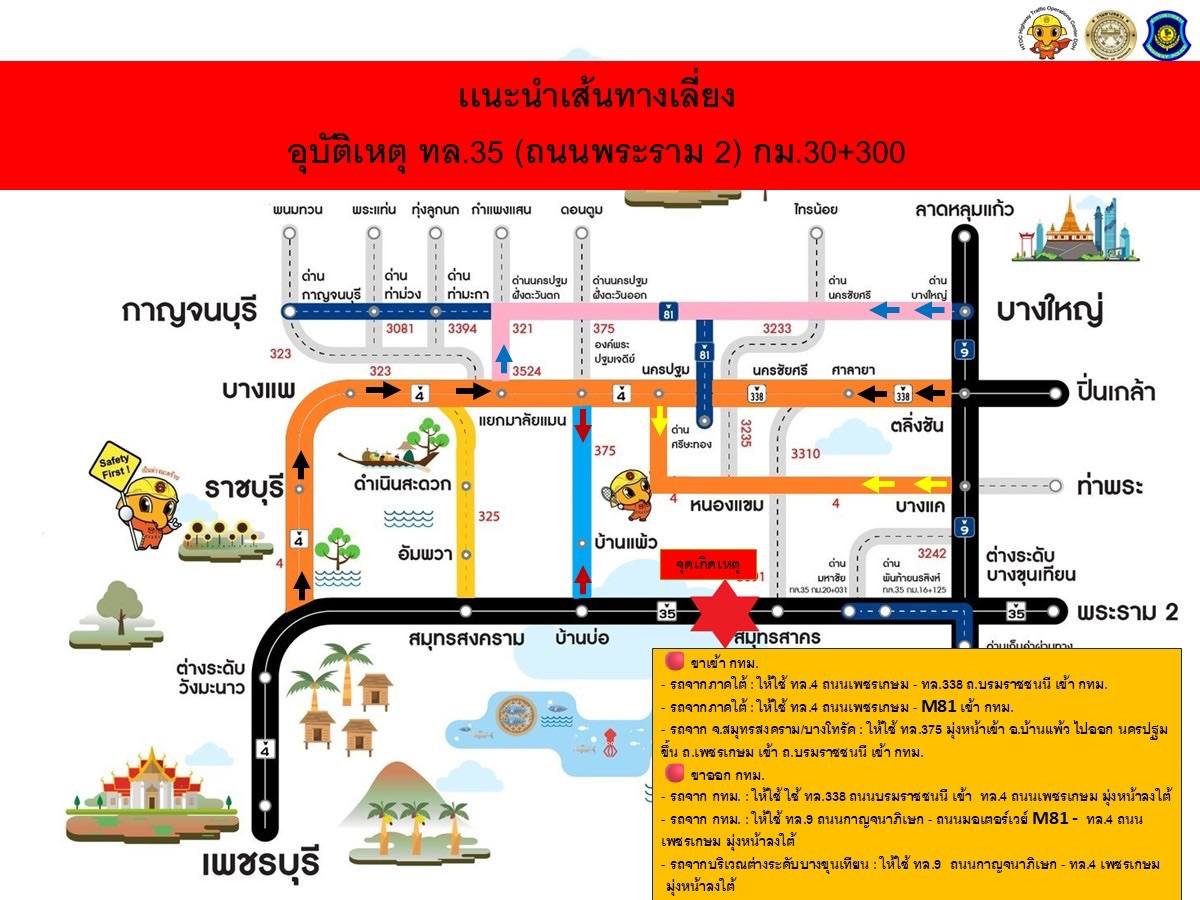 ทางด้านสถานีตำรวจทางหลวงนครปฐม ได้ประชาสัมพันธ์ให้ประชาชนผู้ใช้เส้นทางถนนพระราม 2 หลีกเลี่ยงเส้นทางจากจุดเครนก่อสร้างถล่ม โดยฝั่งขาเข้า รถจากทางภาคใต้ ให้ใช้ถนนเพชรเกษม (ทล.4) เข้ากรุงเทพฯ ส่วนรถจากจังหวัดสมุทรสงคราม ให้ใช้ถนนบ้านแพ้ว-พระประโทน (ทล.375) มุ่งหน้าอำเภอบ้านแพ้ว ไปออกถนนเพชรเกษม ที่จังหวัดนครปฐม หรือไปใช้ถนนบรมราชชนนี (ทล.338) เข้ากรุงเทพฯ ต่อไป และฝั่งขาออก รถจากกรุงเทพฯ ให้ใช้เส้นทางถนนบรมราชชนนี เข้าถนนเพชรเกษม มุ่งหน้าลงใต้