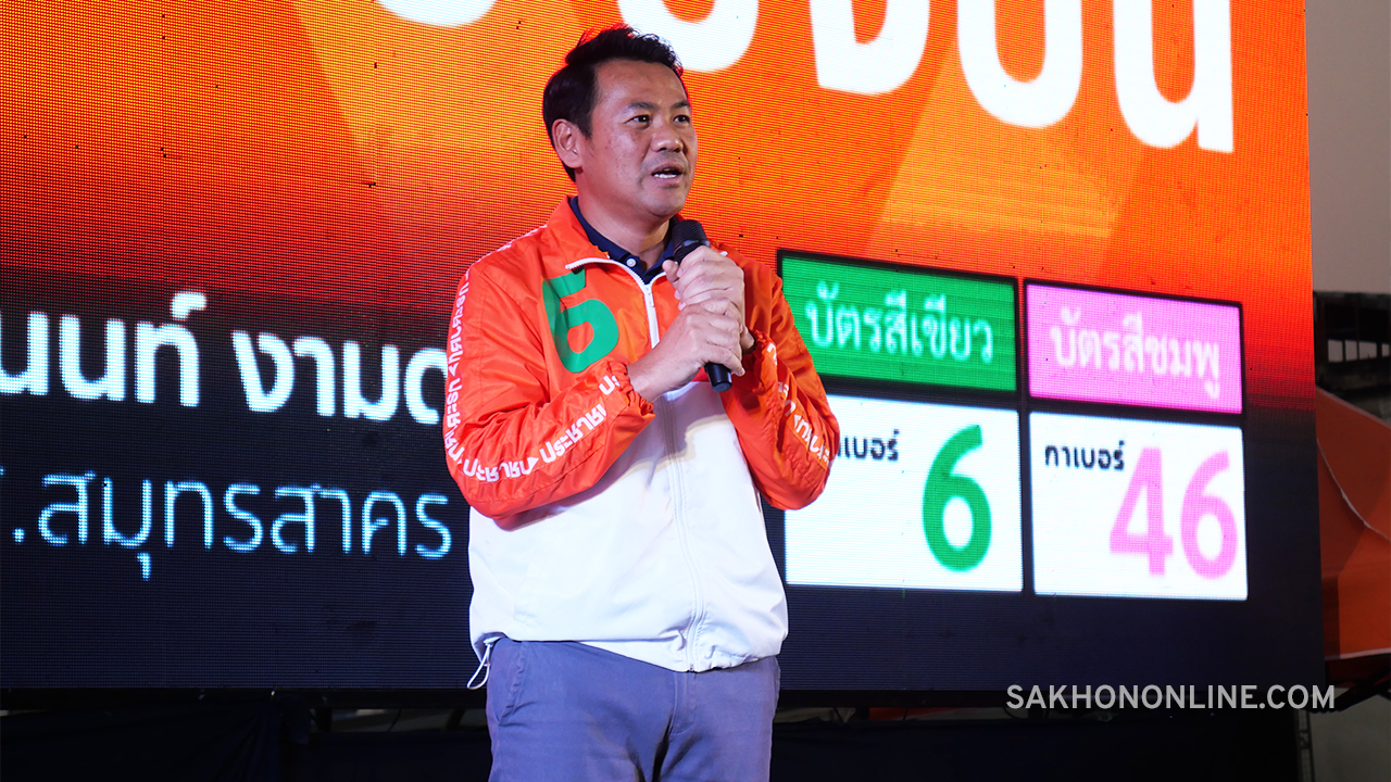 กิจกรรมปราศรัยเริ่มตั้งแต่เวลา 18.00 น. โดยบรรยากาศเป็นไปอย่างคึกคัก เมื่อกลุ่มผู้สนับสนุนทยอยเดินทางมาร่วมงาน จากนั้นผู้สมัคร สส. แบบแบ่งเขต ทั้ง 4 เขตของจังหวัดสมุทรสาคร ได้หมุนเวียนสับเปลี่ยนกันขึ้นมากล่าวปราศรัยถึงนโยบายต่าง ๆ ของพรรค ได้แก่ เขต 4 “เอส” อานนท์ งามดอกไม้ เบอร์ 6 กล่าวปราศรัยในหัวข้อ “เกษตร ยั่งยืน” นำเสนอนโยบายผลักดันเกษตรยั่งยืน 4 ข้อ ได้แก่ 1. จัดทำตลาดที่เป็นธรรมให้เกษตรกร (Fair Trade Market) 2. เปลี่ยนรูปแบบการเพาะปลูก จากเชิงปริมาณเป็นเชิงคุณภาพ 3. การนำเทคโนโลยีสมัยใหม่เข้ามาช่วย (โดรนเพื่อการเกษตร, เทคโนโลยีด้าน IoT) และ 4. ผลักดัน Young Smart Farmer ยุค 4.0
