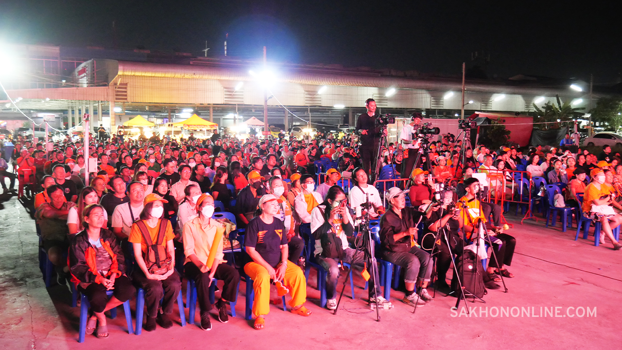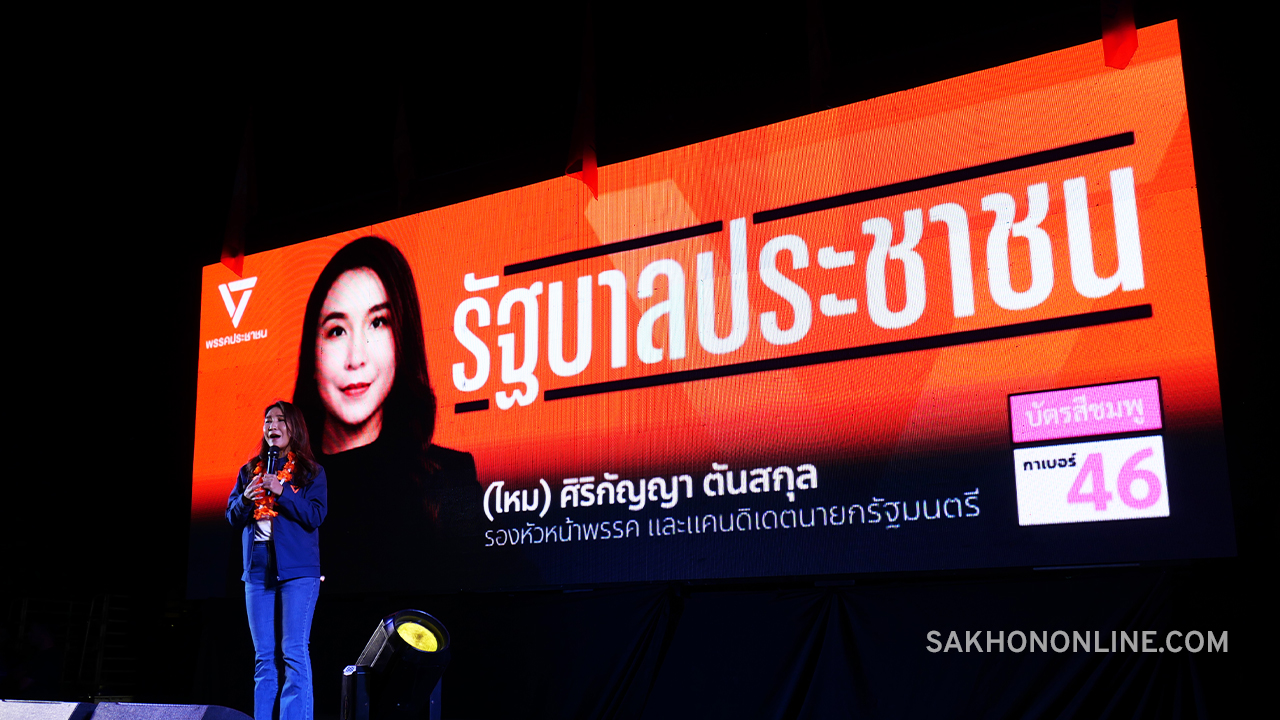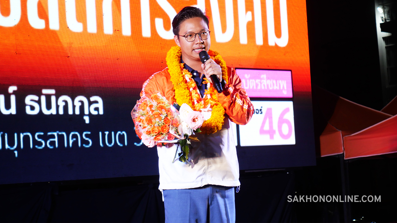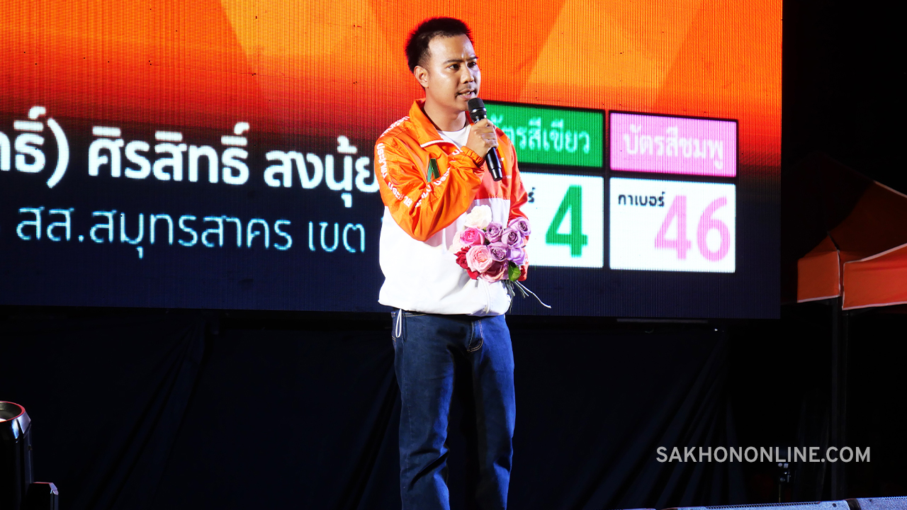 จากนั้นผู้สมัคร สส. แบบบัญชีรายชื่อ พรรคประชาชน ประกอบด้วย “โตโต้” ปิยรัฐ จงเทพ, “ไอซ์” รักชนก ศรีนอก และ “กาย” ณัฐชา บุญไชยอินสวัสดิ์ ก็ขึ้นกล่าวปราศรัยตามลำดับ พร้อมเชิญชวนให้ประชาชนเลือกพรรคประชาชน ทั้งแบบแบ่งเขต และแบบบัญชีรายชื่อ เบอร์ 46 ก่อนปิดท้ายด้วย ศิริกัญญา ตันสกุล รองหัวหน้าพรรคประชาชน และ 1 ใน 3 แคนดิเดตนายกรัฐมนตรีของพรรคฯ ได้ขึ้นกล่าวปราศรัยตอนหนึ่งว่า ตนท้อแท้ชาวสมุทรสาครเหลือเกิน กับเรื่องราวที่เกิดขึ้นกับปัญหาถนนพระราม 2 อุบัติเหตุซ้ำแล้วซ้ำเล่าแก้ไม่หายสักที สมุดพกผู้รับเหมาก็ไม่มาสักที มาตอนนี้มีเหตุเครนถล่มก็จะมาปิดถนนอีก “คนนะไม่ใช่หุ่นยนต์ ที่ต้องมาทนรถติดทุกวัน” อันนี้ตนทนไม่ไหวก็ต้องออกมาสู้ ถึงแม้จะไม่มีอำนาจอยู่ในมือ ก็ต้องออกมาพูดเพื่อเตือนสติคนที่นั่งอยู่ในรัฐบาลตอนนี้ ว่าแก้ปัญหาแบบปะผุแบบนี้ต่อไปเรื่อย ๆ ไม่ได้