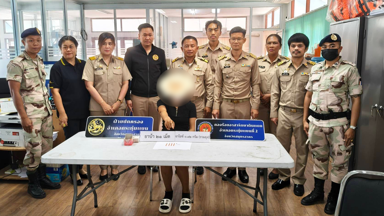 จากการตรวจสอบพบนางเอ (นามสมมติ) อายุ 40 ปี ในที่พัก มีลักษณะอาการหลอนประสาทคล้ายผู้เสพสารเสพติด สอบถามเบื้องต้นให้การยอมรับว่าเสพสารเสพติดจริง เจ้าหน้าที่ชุดจับกุมจึงได้ทำการตรวจค้นที่พักอาศัยเพิ่มเติม ตรวจพบสารเสพติดอยู่บริเวณเตียงนอน ได้แก่ ยาบ้า จำนวน 21 เม็ด และยาไอซ์ จำนวน 0.42 กรัม เจ้าหน้าที่จึงแจ้งข้อกล่าวหาว่า “มียาเสพติดให้โทษประเภท 1 เมทแอมเฟตามีน (ยาบ้า) ไว้ในครอบครองโดยผิดกฎหมาย” และ “เสพยาเสพติดให้โทษประเภท 1 เมทแอมเฟตามีน (ยาบ้า) โดยผิดกฎหมาย” เจ้าหน้าที่จึงได้นำตัวผู้ต้องหามาทำบันทึกจับกุม ณ ที่ว่าการอำเภอกระทุ่มแบน ก่อนส่งตัวให้กับพนักงานสอบสวน สภ.กระทุ่มแบน ดำเนินการตามกฎหมายต่อไป