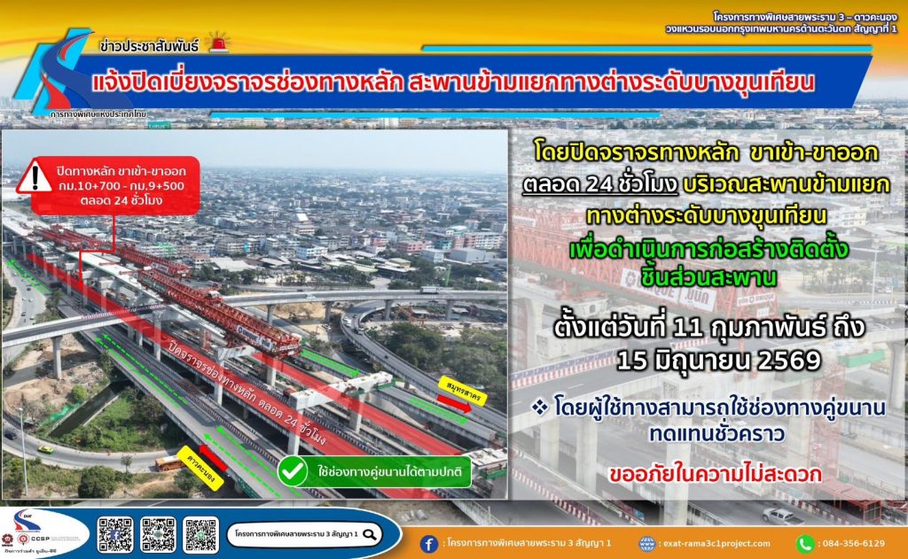 นอกจากนี้ โครงการทางพิเศษสายพระราม 3 สัญญา 1 แจ้งปิดเบี่ยงจราจรช่องทางหลัก บนถนนพระรามที่ 2 โดยปิดจราจรทางหลัก (ขาเข้า-ขาออก) ตลอด 24 ชั่วโมง ตั้งแต่ช่วงก่อนถึงโรงเหล้าแสงจันทร์ ถึงโรงพยาบาลนครธน (กม. 6+350 ถึง กม. 7+500) เพื่อดำเนินการก่อสร้างติดตั้งชิ้นส่วนสะพาน ตั้งแต่วันพุธที่ 11 ถึงวันอาทิตย์ที่ 22 ก.พ. 2569 หรือจนกว่าจะแล้วเสร็จ โดยผู้ใช้ทางสามารถใช้ช่องทางคู่ขนานทดแทนชั่วคราว