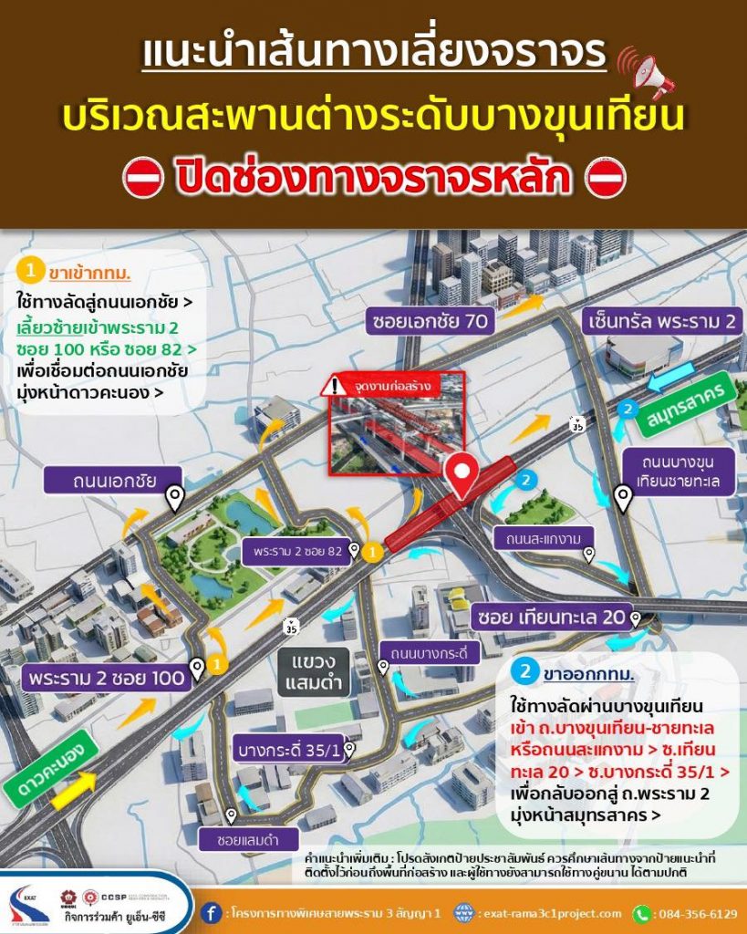 การทางพิเศษแห่งประเทศไทย ปิดเบี่ยงการจราจรช่องทางหลัก ถนนพระรามที่ 2 ตลอด 24 ชั่วโมง ช่วงโรงเหล้าแสงจันทร์ 11 วัน และช่วงทางแยกต่างระดับบางขุนเทียน 4 เดือน เพื่อก่อสร้างติดตั้งชิ้นส่วนพื้นสะพาน โครงการทางพิเศษสายพระราม 3 สัญญา 1 พบแล้วเสร็จ 2 สัญญา ส่วนสัญญา 3 ช้ากว่าแผน 4.42%