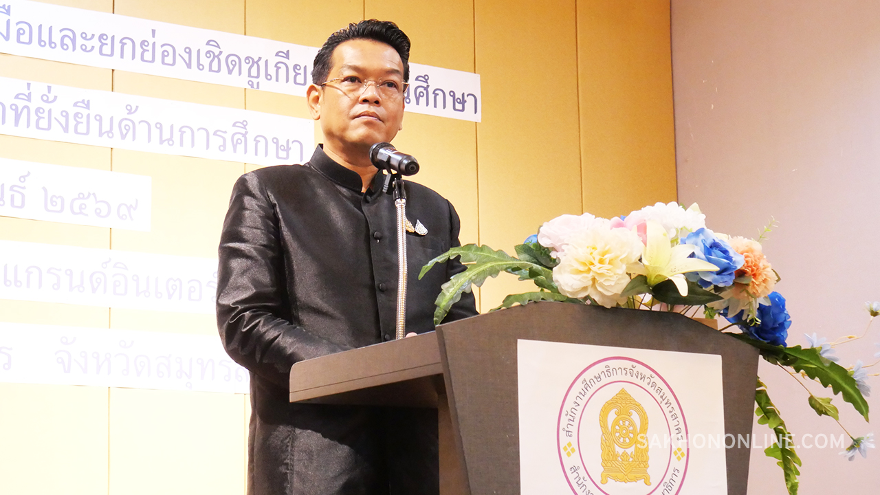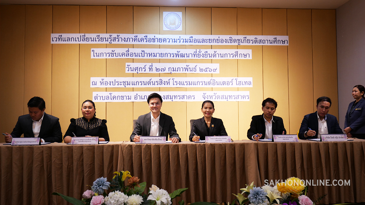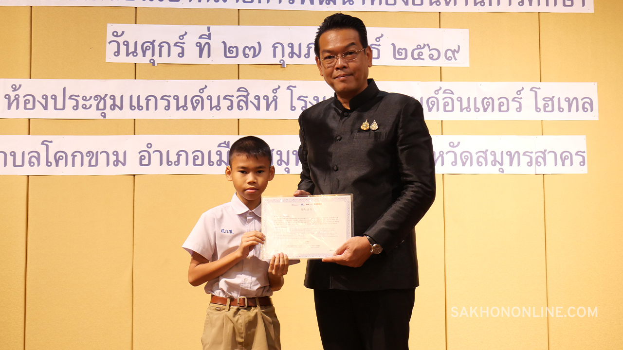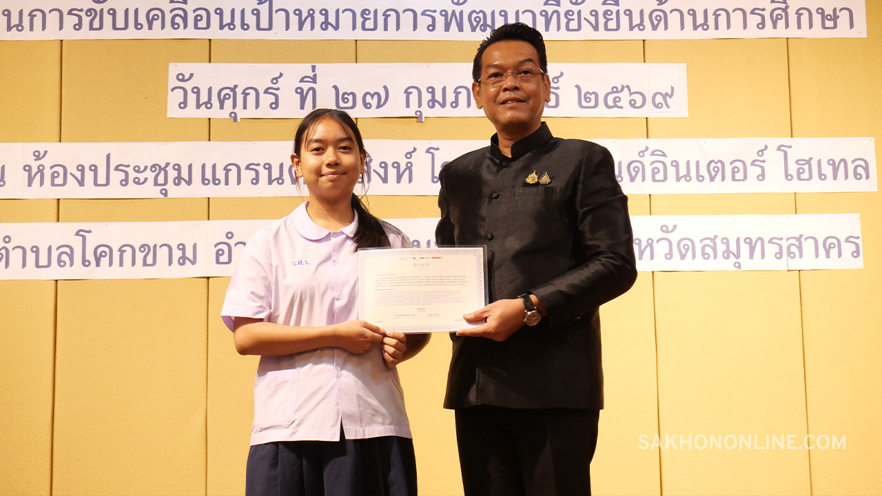 เมื่อเวลา 08.30 น. วันที่ 27 ก.พ. 2569 ที่ห้องประชุมแกรนด์นรสิงห์ โรงแรมแกรนด์ อินเตอร์ โฮเทล ต.โคกขาม อ.เมืองฯ จ.สมุทรสาคร นายดำรงศักดิ์ ยอดทองดี รองผู้ว่าราชการจังหวัดสมุทรสาคร เป็นประธานในพิธีเปิดการจัดเวทีแลกเปลี่ยนเรียนรู้สร้างภาคีเครือข่ายความร่วมมือและยกย่องเชิดชูเกียรติสถานศึกษา ในการขับเคลื่อนเป้าหมายการพัฒนาที่ยั่งยืนด้านการศึกษา พร้อมมอบเกียรติบัตรจาก UNSECO ให้แก่นักเรียน จำนวน 17 คน และเกียรติบัตรจากสำนักงานศึกษาธิการจังหวัดสมุทรสาคร ให้แก่สถานศึกษา 14 แห่ง ที่ร่วมขับเคลื่อนเป้าหมายการพัฒนาที่ยั่งยืนด้านการศึกษา (SDG4) ในปี 2568