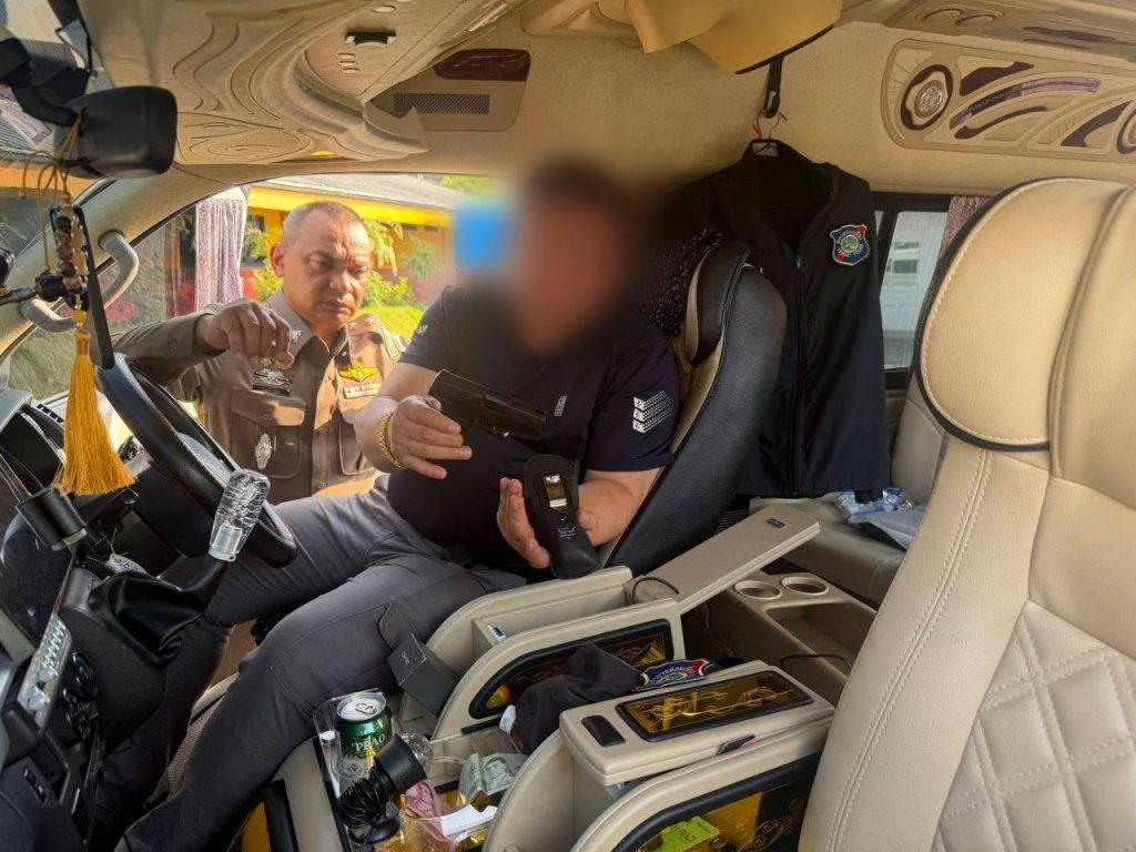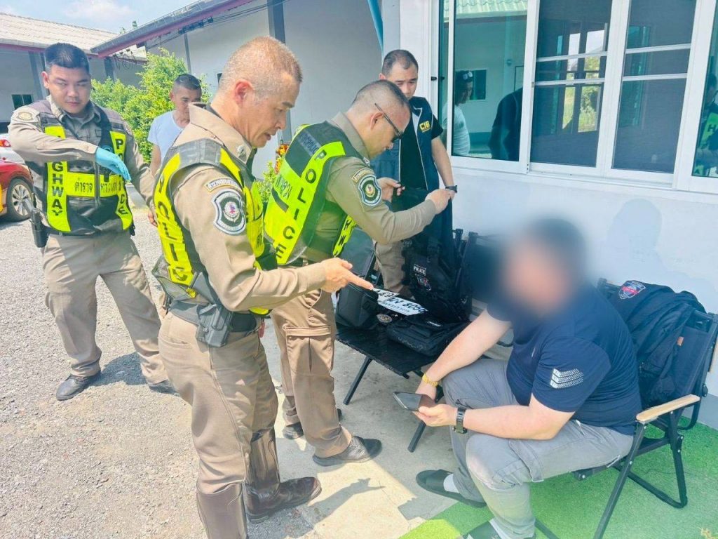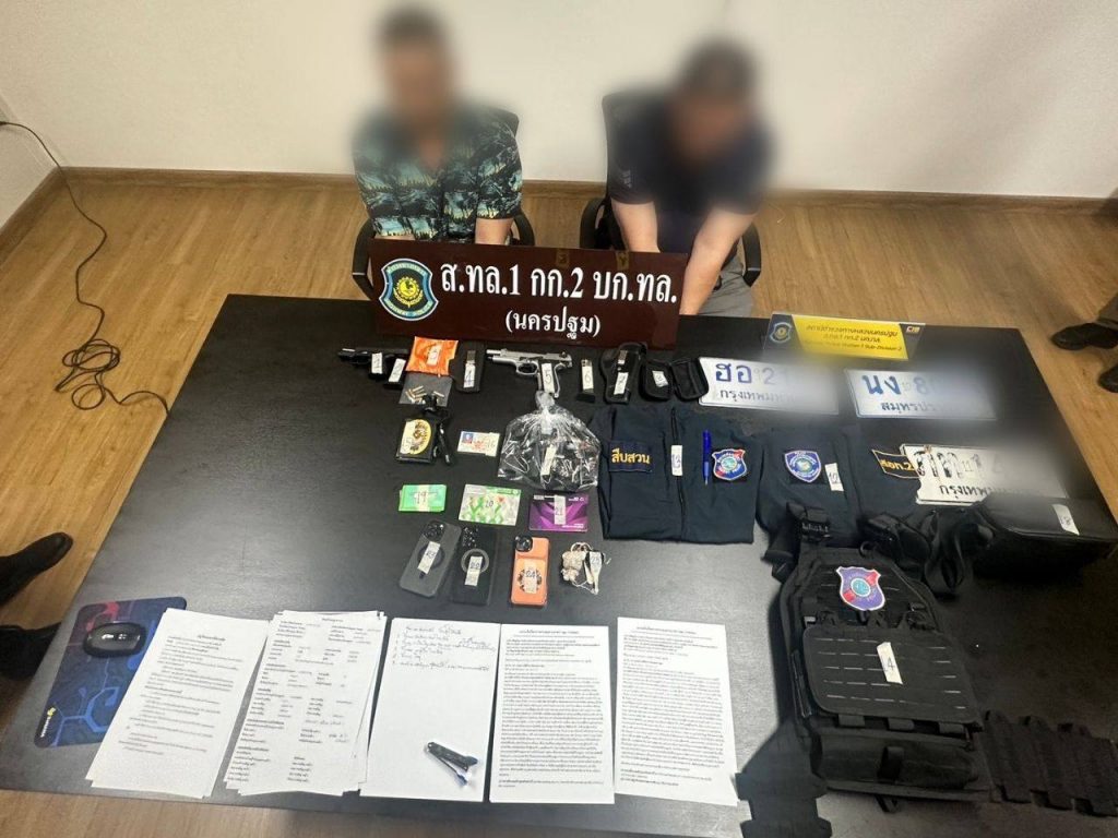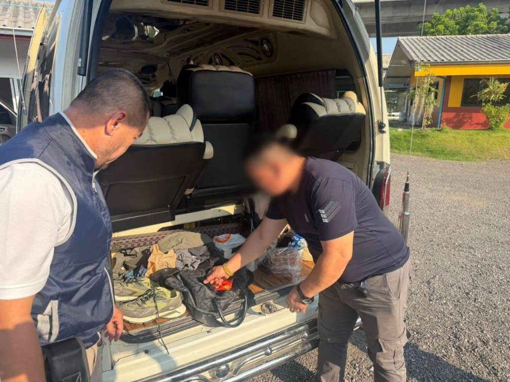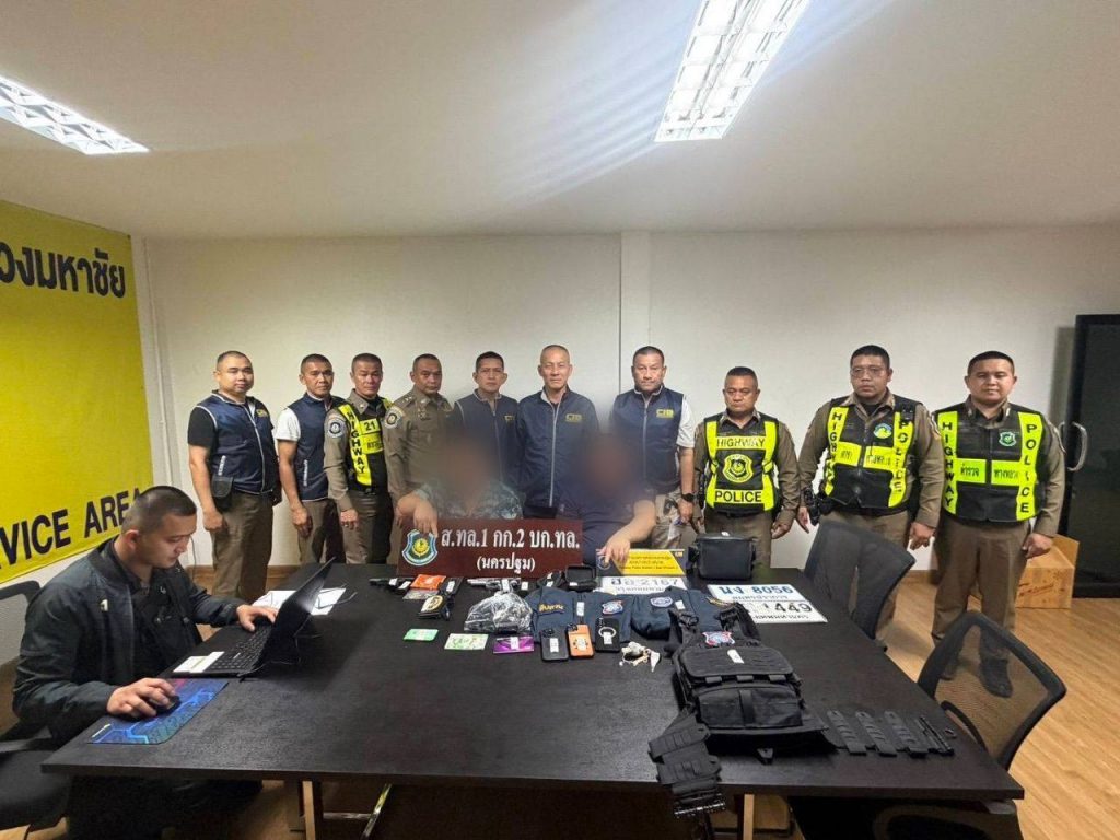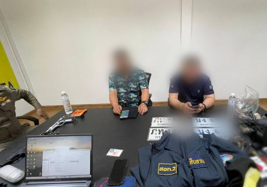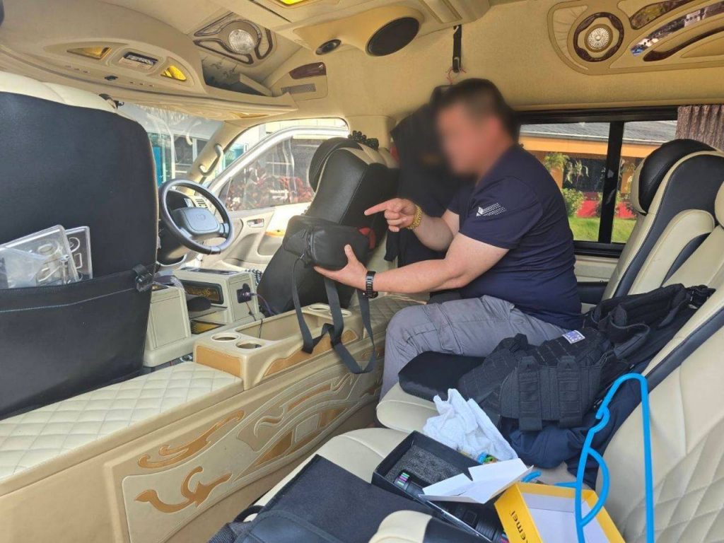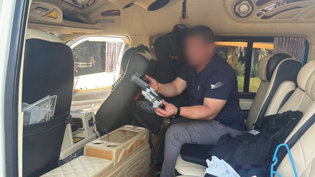 จากการตรวจค้นภายในรถตู้ พบอาวุธปืนขนาด 9 มม. พร้อมกระสุน แผ่นป้ายทะเบียนปลอมและป้ายที่ถูกสำนักงานขนส่งระงับการใช้งาน ตำรวจเชื่อว่าใช้สับเปลี่ยนเพื่อหลบเลี่ยงการตรวจสอบของเจ้าหน้าที่ นอกจากนี้ยังพบโดรน DJI Mini 4 Pro วิทยุสื่อสารแบบใส่ซิม 8 เครื่อง เสื้อเกราะกันกระสุน เสื้อหน่วยงานตำรวจหลายสังกัด ป้ายห้อยคอสำนักงานตำรวจแห่งชาติ รวมถึงยาไอซ์ 1 ถุงเล็ก จึงตรวจยึดของกลางทั้งหมดไว้เป็นหลักฐาน จากการสอบปากคำทั้งสองคนให้การวกไปวนมา เบื้องต้นตำรวจเชื่อว่าเป็นขบวนการสวมรอยเจ้าหน้าที่รัฐ เพื่อก่อเหตุหลอกลวงและข่มขู่ประชาชน โดยไม่เกรงกลัวกฎหมาย