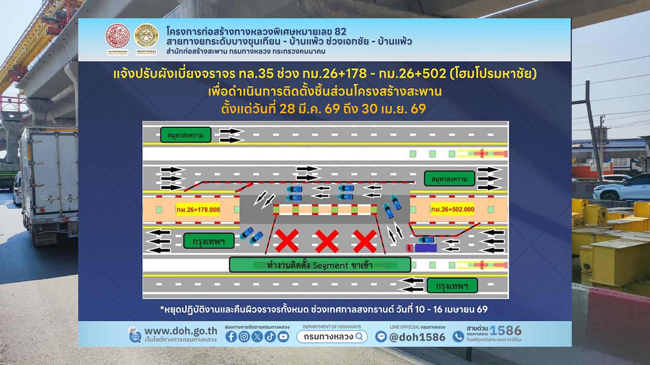 สำนักก่อสร้างสะพาน กรมทางหลวง แจ้งประชาสัมพันธ์การปรับทิศทางการเบี่ยงการจราจรบนทางหลวงหมายเลข 35 (ถนนพระราม 2) บริเวณช่วง กม.26+178 ถึง กม.26+502 (ช่วงหน้าห้างโฮมโปรมหาชัย) และสะพานกลับรถที่ กม.26 ฝั่งขาเข้ากรุงเทพ เพื่อดำเนินการติดตั้งชิ้นส่วนโครงสร้างโครงการทางหลวงพิเศษหมายเลข 82 (M82) สายทางยกระดับบางขุนเทียน – บ้านแพ้ว (ตอน 4) ตามแผนงานก่อสร้าง