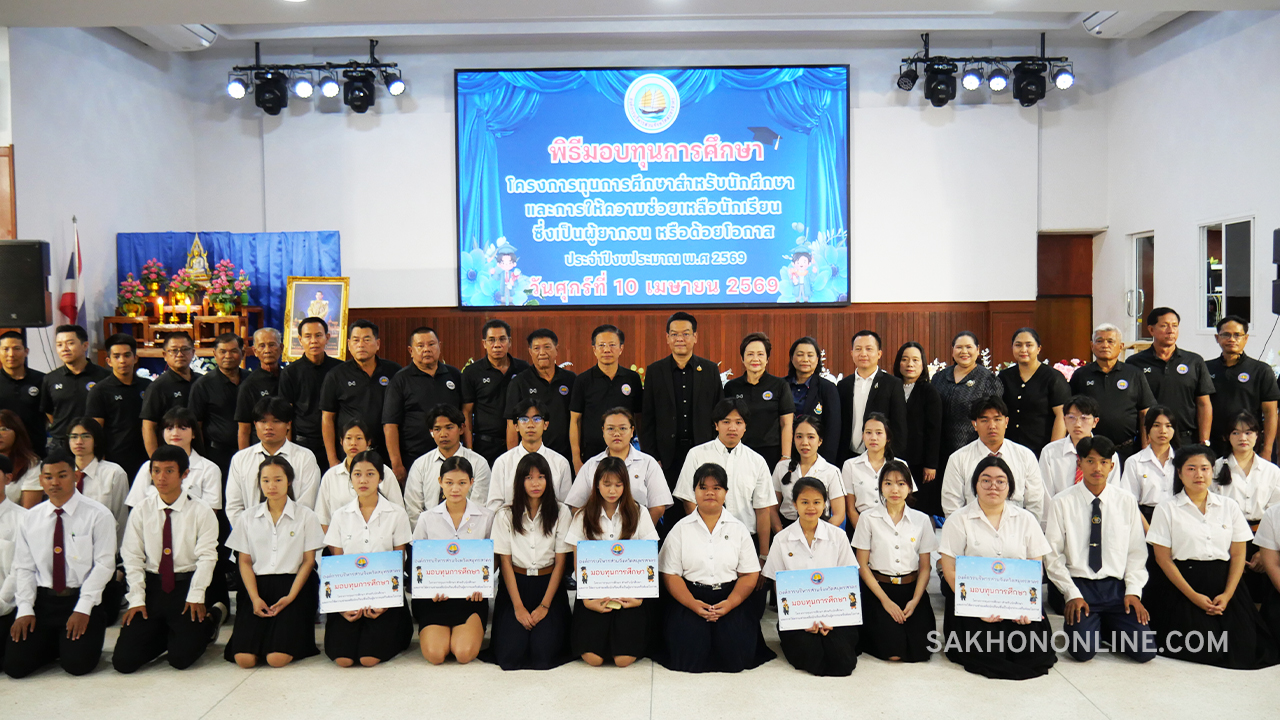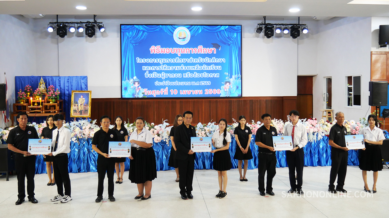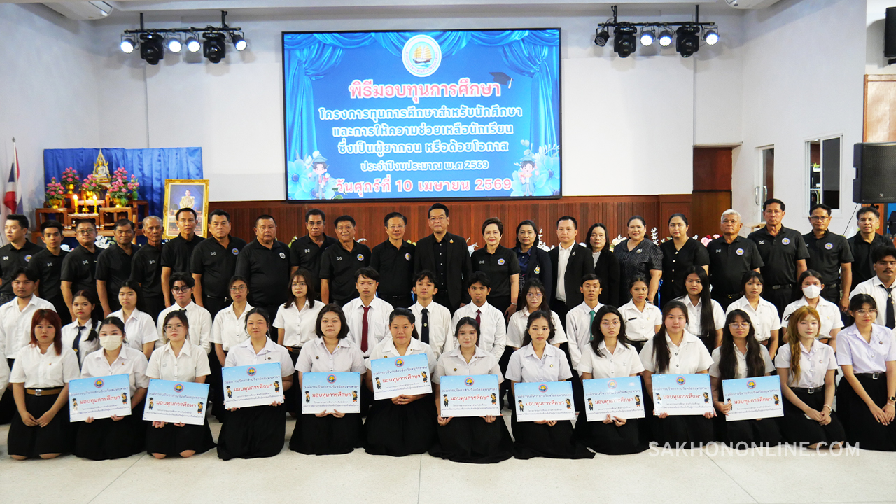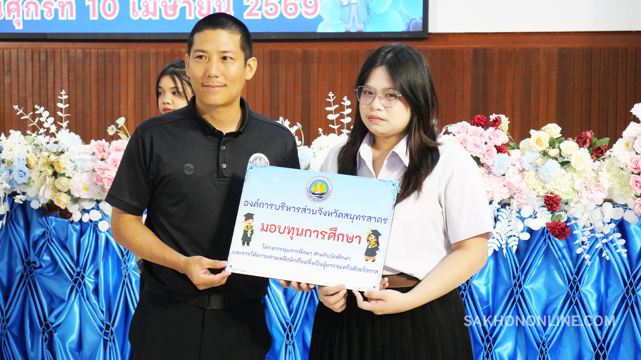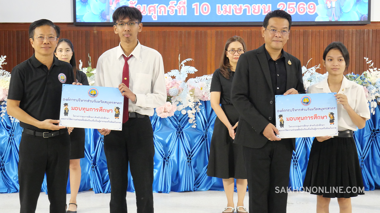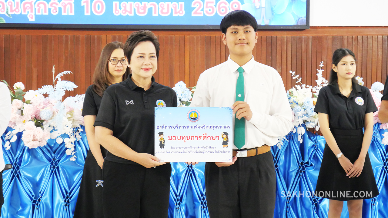 เมื่อเวลา 09.00 น. วันที่ 10 เม.ย. 2569 ที่หอประชุม 90 ปี โรงเรียนสมุทรสาครวิทยาลัย ต.มหาชัย อ.เมืองฯ จ.สมุทรสาคร องค์การบริหารส่วนจังหวัดสมุทรสาคร (อบจ.สมุทรสาคร) จัดพิธีมอบทุนการศึกษา ตามโครงการทุนการศึกษาสำหรับนักศึกษาและการให้ความช่วยเหลือนักเรียนซึ่งเป็นผู้ยากจน หรือด้อยโอกาส ประจำปีงบประมาณ พ.ศ. 2569 โดยมี นายดำรงค์ศักดิ์ ยอดทองดี รองผู้ว่าราชการจังหวัดสมุทรสาคร เป็นประธานในพิธีฯ พร้อมด้วย นายอุดม ไกรวัตนุสสรณ์ นายก อบจ.สมุทรสาคร คณะผู้บริหาร สมาชิกสภา คณะครู แขกผู้มีเกียรติ และนักเรียน-นักศึกษาที่เข้ารับทุนการศึกษาในภาคเรียนที่ 2/2568 ปีงบประมาณ พ.ศ.2569 จำนวน 188 คน