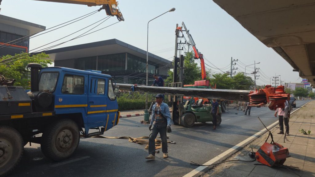 ขณะที่รถเครนที่ใช้บังคับบูมนั้นล้มตะแคงอยู่ภายในรั้วของบริษัท คูโบต้า ดี.เอ็น.เอ็ม. มีนายศุวิทย์ ชาตวนิช อายุ 62 ปี เป็นคนขับ กำลังเร่งหาทางยกบูมที่ล้มลงไปกลับเข้ามาภายในบริเวณของงานก่อสร้างให้ได้โดยเร็วที่สุด ซึ่งได้วางแผนใช้รถเครน 2 คัน มาพยุงบูมทั้ง 2 ข้างไว้ แล้วถอดอุปกรณ์ออกจากจุดที่เชื่อมต่อกับตัวรถ จากนั้นก็ยกบูมไปไว้ข้างในพื้นที่บริเวณก่อสร้างของบริษัทฯ ใช้เวลาย้ายสิ่งกีดขวางประมาณ 2 ชั่วโมง ขณะเดียวกัน เจ้าหน้าที่จากการไฟฟ้าส่วนภูมิภาคได้ระดมกำลังมาซ่อมสายไฟฟ้าแรงสูงที่ได้รับความเสียหาย เพื่อบรรเทาความเดือดร้อนของผู้ใช้ไฟฟ้า