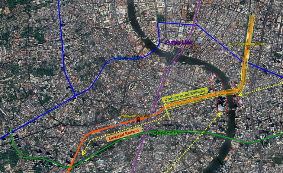 แนวเส้นทางนี้ส่วนใหญ่ 75% เป็นเขตทางรถไฟเดิม ทำให้ลดพื้นที่เวนคืนลง อีกทั้งผ่านการพิจารณามาแล้ว ตำแหน่งสถานีปลายทางอยู่ใกล้พื้นที่เปิดโล่ง สามารถออกแบบวางแนวต่อเชื่อมในอนาคตง่าย แต่ช่วงปลายทางพาดผ่านแหล่งชุมชนขนาดใหญ่ จุดสิ้นสุดอยู่ที่ห้างบิ๊กซีมหาชัย มีความยุ่งยากในการเวนคืนที่ดิน อีกทั้งแนวเส้นทางตัดผ่านถนนพระรามที่ 2 ต้องก่อสร้างเป็นทางยกระดับเสาสูง อยู่ระดับ 3 ถึง 4 ซึ่งมีมูลค่าการก่อสร้างสูงมาก และแนวเส้นทางนี้มีระยะทางยาวที่สุด แต่มีจำนวนสถานีน้อยที่สุด