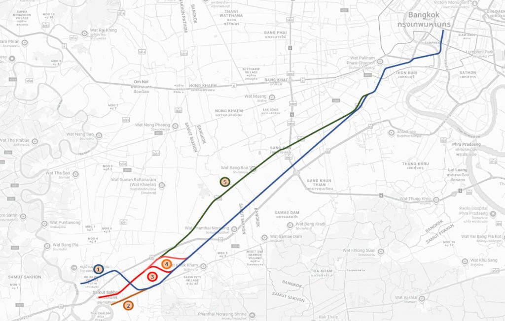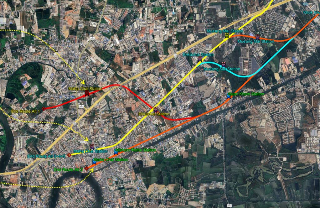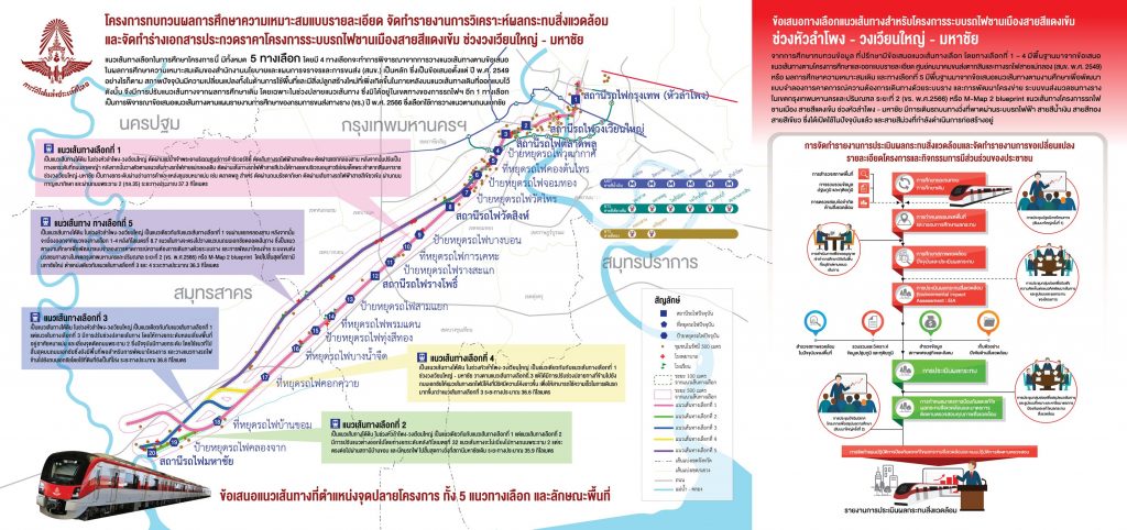 การรถไฟแห่งประเทศไทย (ร.ฟ.ท.) เปิดการประชุมรับฟังความคิดเห็นของประชาชน (ปฐมนิเทศโครงการ) เพื่อทบทวนผลการศึกษาความเหมาะสม แบบรายละเอียด จัดทำรายงานการวิเคราะห์ผลกระทบสิ่งแวดล้อม และจัดทำร่างเอกสารประกวดราคา โครงการระบบรถไฟชานเมืองสายสีแดงเข้มช่วงวงเวียนใหญ่ – มหาชัย ซึ่งได้ทบทวนแนวเส้นทางรถไฟตามผลการศึกษาความเหมาะสม และผลการศึกษาของโครงการที่มีความเกี่ยวข้อง ก่อนคัดเลือกแนวเส้นทาง 5 ทางเลือก ดังนี้