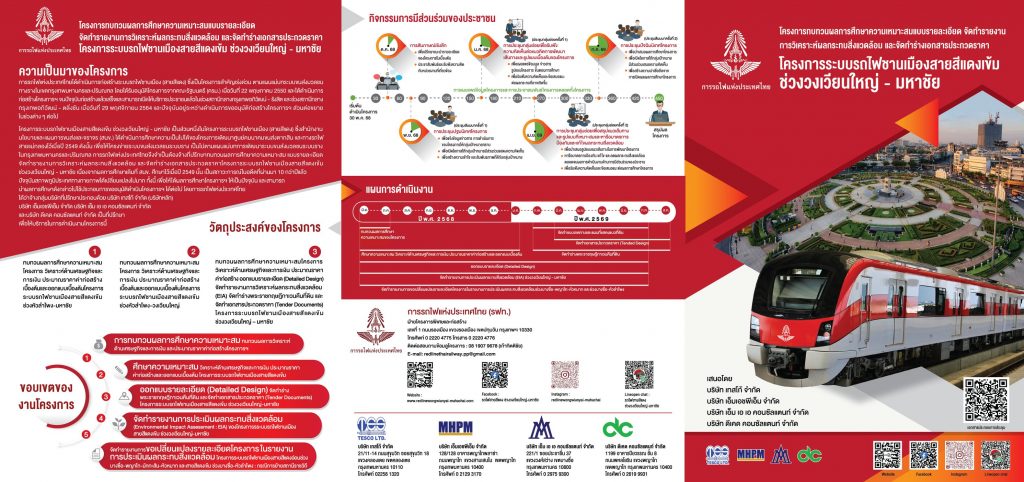 สำหรับการทบทวนผลการศึกษาความเหมาะสม แบบรายละเอียด จัดทำรายงานการวิเคราะห์ผลกระทบสิ่งแวดล้อม และจัดทำร่างเอกสารประกวดราคาโครงการระบบรถไฟชานเมืองสายสีแดงเข้ม ช่วงวงเวียนใหญ่ – มหาชัย มีระยะเวลาดำเนินงาน 450 วัน สิ้นสุดเดือน ส.ค. 2569 ผู้สนใจสามารถติดตามข่าวสารได้ที่เฟซบุ๊ก “รถไฟสายสีแดง ช่วงวงเวียนใหญ่-มหาชัย” อินสตาแกรม redlinewongwianyai_mahachai และ Line Openchat: รถไฟสายสีแดง ช่วงวงเวียนใหญ่-มหาชัย