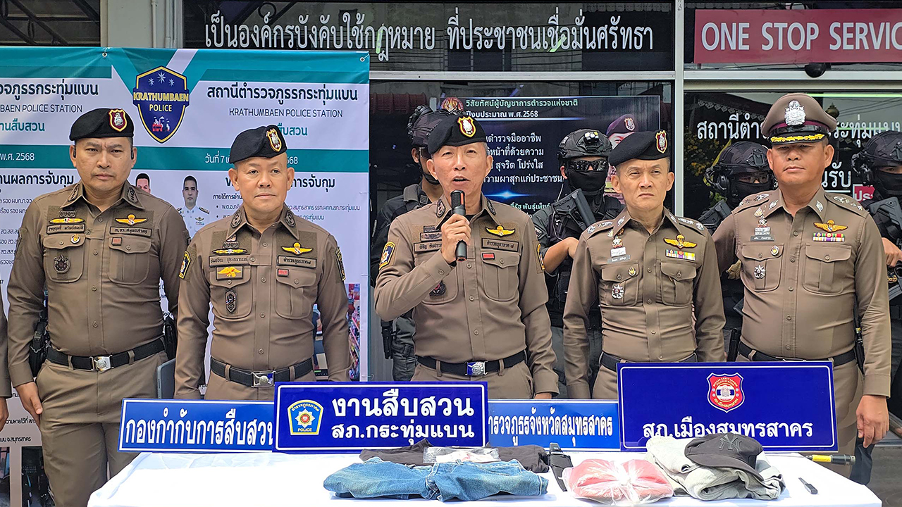 เมื่อเวลา 11.00 น. วันที่ 8 ต.ค. 2568 ที่สถานีตำรวจภูธรกระทุ่มแบน จ.สมุทรสาคร พล.ต.ท.พิสิฐ ตันประเสริฐ ผบช.ภ.7 พล.ต.ต.ชมชวิณ ปุระธนานนท์ รอง ผบช.ภ.7 พล.ต.ต.ธีระเดช อธิภัคกุล ผบก.ภ.จว. สมุทรสาคร พ.ต.อ.ภคิน ศิวเมธากุล รอง ผบก.ภ.จว.สมุทรสาคร รรท. ผกก.สภ.กระทุ่มแบน พ.ต.อ.พิเชษฐ์พงศ์ แจ้งค้ายคม ผกก.สภ.เมืองสมุทรสาคร พ.ต.อ.สุรศักดิ์ สิทธิโชคธรรม ผกก.สส.ภ.จว.สมุทรสาคร พ.ต.ท.ศักดิ์สิทธิ์ ชูบุญเรือง รอง ผกก.สส.สภ.กระทุ่มแบน และเจ้าหน้าที่ตำรวจชุดสืบสวนจับกุมฯ ร่วมกันแถลงข่าวผลการจับกุมผู้ต้องหาก่อเหตุคดีอาญา 3 ราย ในพื้นที่ความรับผิดชอบของ สภ.เมืองสมุทรสาคร 1 ราย และ สภ.กระทุ่มแบน 2 ราย ดังต่อไปนี้