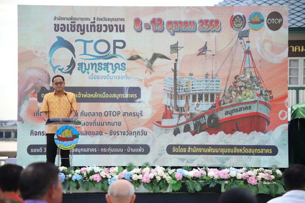 สำหรับงาน “OTOP สมุทรสาคร เมื่อของดีมาเจอกัน” ครั้งที่ 2 จัดขึ้นระหว่างวันที่ 8-13 ต.ค. 2568 ณ ริมเขื่อนศาลเจ้าพ่อหลักเมืองสมุทรสาคร เพื่อเพิ่มช่องทางการจำหน่ายสินค้า และเพิ่มรายได้ให้แก่ผู้ผลิต ผู้ประกอบการของจังหวัดสมุทรสาคร ที่เข้าร่วมโครงการฯ อีกทั้งยังเปิดโอกาสให้ผู้ผลิต ผู้ประกอบการโอทอปได้แลกเปลี่ยนเรียนรู้ สร้างเครือข่ายทางธุรกิจ และเพิ่มศักยภาพการแข่งขันในตลาดอีกทางหนึ่งด้วย โดยภายในงานมีการออกร้านจำหน่ายสินค้าโอทอป สินค้าท้องถิ่น ของดีทั้ง 3 อำเภอ พร้อมกิจกรรมให้ร่วมสนุกชิงรางวัลมากมาย