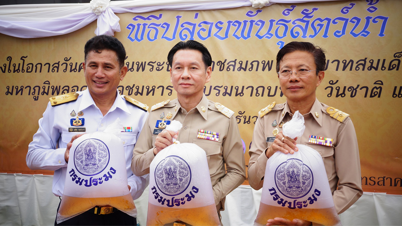 สำหรับพิธีปล่อยพันธุ์สัตว์น้ำ เนื่องในวันคล้ายวันพระบรมราชสมภพ พระบาทสมเด็จพระบรมชนกาธิเบศร มหาภูมิพลอดุลยเดชมหาราช บรมนาถบพิตร วันชาติ และวันพ่อแห่งชาติ ทุกภาคส่วนได้ร่วมกันปล่อยพันธุ์กุ้งกุลาดำ จำนวน 1,000,000 ตัว จากสำนักงานประมงจังหวัดสมุทรสาคร ลงสู่แม่น้ำท่าจีน ทั้งนี้ เพื่อถวายเป็นพระราชกุศล และน้อมรำลึกในพระมหากรุณาธิคุณของในหลวงรัชกาลที่ 9 พร้อมสร้างจิตสำนึกในการอนุรักษ์ทรัพยากรน้ำและสัตว์น้ำตามแนวพระราชดำริ เพื่อประโยชน์ต่อชุมชนและสิ่งแวดล้อมอย่างยั่งยืน