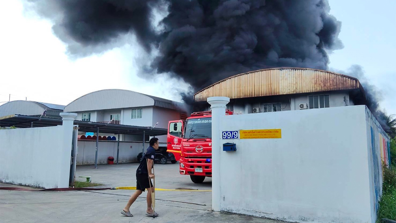 เมื่อเวลา 10.00 น. วันที่ 5 เม.ย. 2569 เกิดเหตุเพลิงไหม้บริษัท เมต้าอิ้งค์ โกลด์ (ประเทศไทย) จำกัด ประกอบกิจการผลิตสีสำหรับงานพิมพ์ ตั้งอยู่เลขที่ 99/9 หมู่ 4 ต.คลองมะเดื่อ อ.กระทุ่มแบน จ.สมุทรสาคร ลักษณะเป็นอาคารโกดังชั้นเดียว พื้นที่ประมาณ 1 ไร่ โดยเพลิงได้โหมลุกไหม้รุนแรงอยู่ด้านในตัวอาคาร เจ้าหน้าที่จากงานป้องกันและบรรเทาสาธารณภัยจากเทศบาลตำบลคลองมะเดื่อ และพื้นที่ใกล้เคียง ระดมรถน้ำดับเพลิงกว่า 10 คัน เร่งฉีดน้ำสกัดเพลิงอย่างต่อเนื่อง