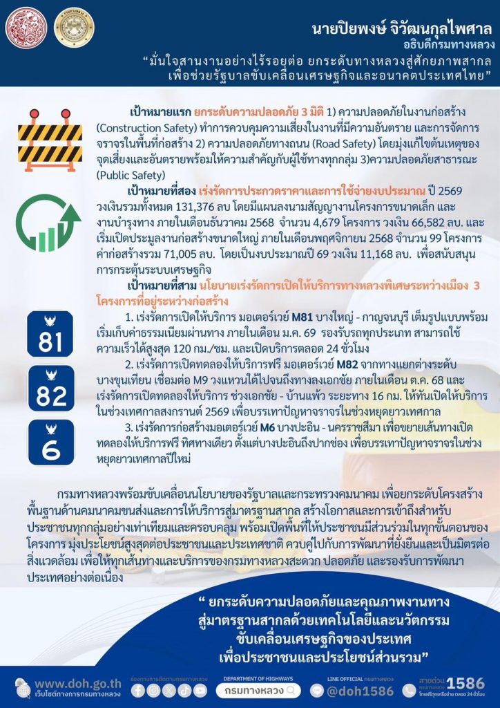 สอดคล้องกับนายปิยพงษ์ จิวัฒนกุลไพศาล อธิบดีกรมทางหลวง ตั้งเป้าหมายเร่งรัดการเปิดทดลองให้บริการฟรี มอเตอร์เวย์ M82 จากทางแยกต่างระดับบางขุนเทียน เชื่อมต่อ M9 วงแหวนใต้ไปจนถึงทางลงเอกชัย ภายในเดือน ต.ค. 68 และเร่งรัดการเปิดทดลองให้บริการช่วงเอกชัย-บ้านแพ้ว ระยะทาง 16 กิโลเมตร ให้ทันเปิดให้บริการในช่วงเทศกาลสงกรานต์ 2569 เพื่อบรรเทาปัญหาจราจรในช่วงหยุดยาวเทศกาล